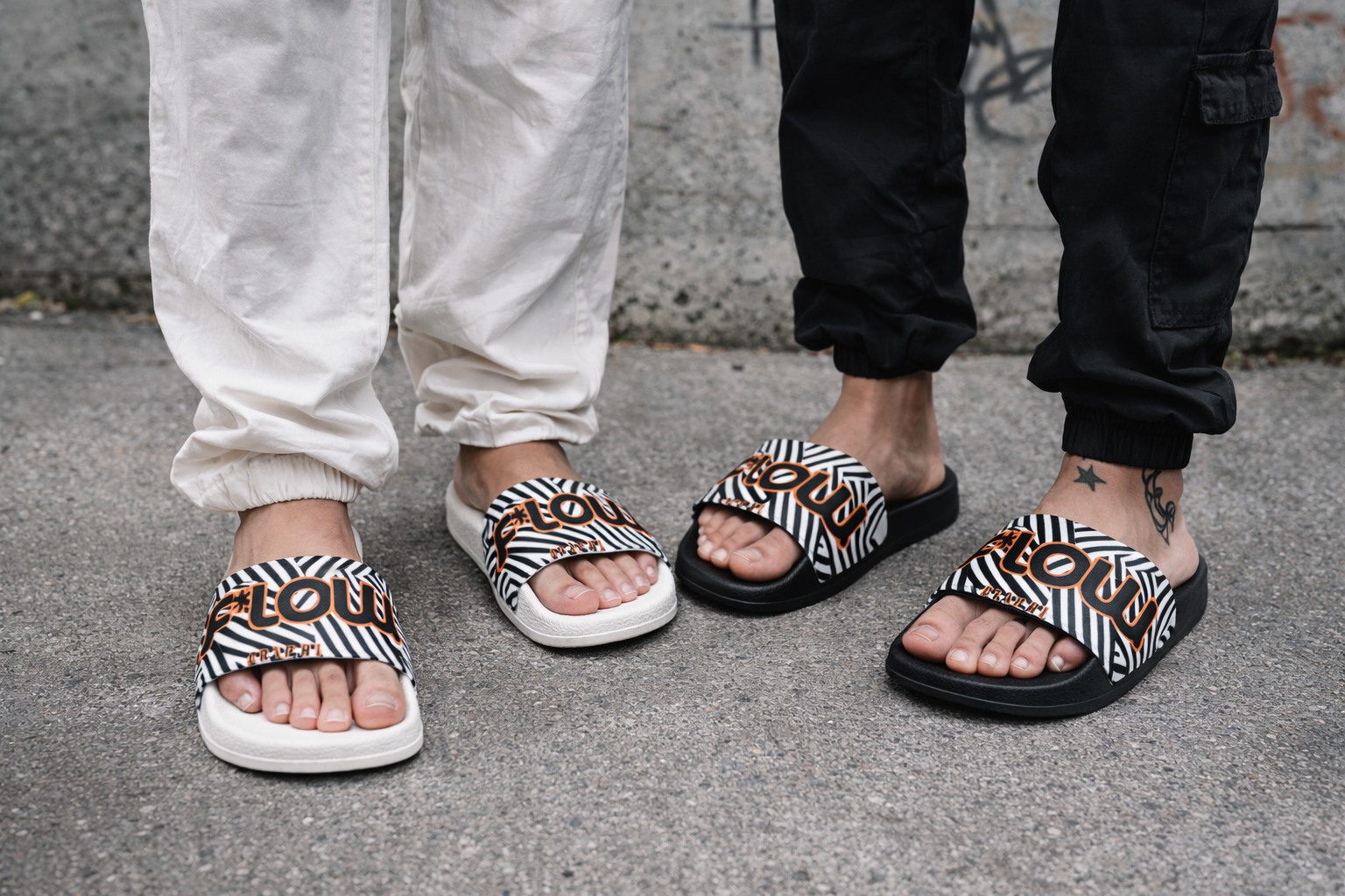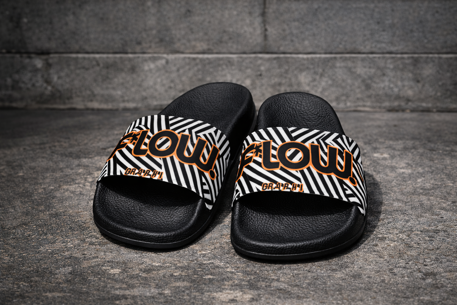 The F*LOW logo stands out on a bold black & white geometric background, creating a clean, high-contrast aesthetic made for those who see style as a visual language. Designed for daily wear, post-workout moments, or urban summer days, these slides move with you—light, effortless, and expressive.